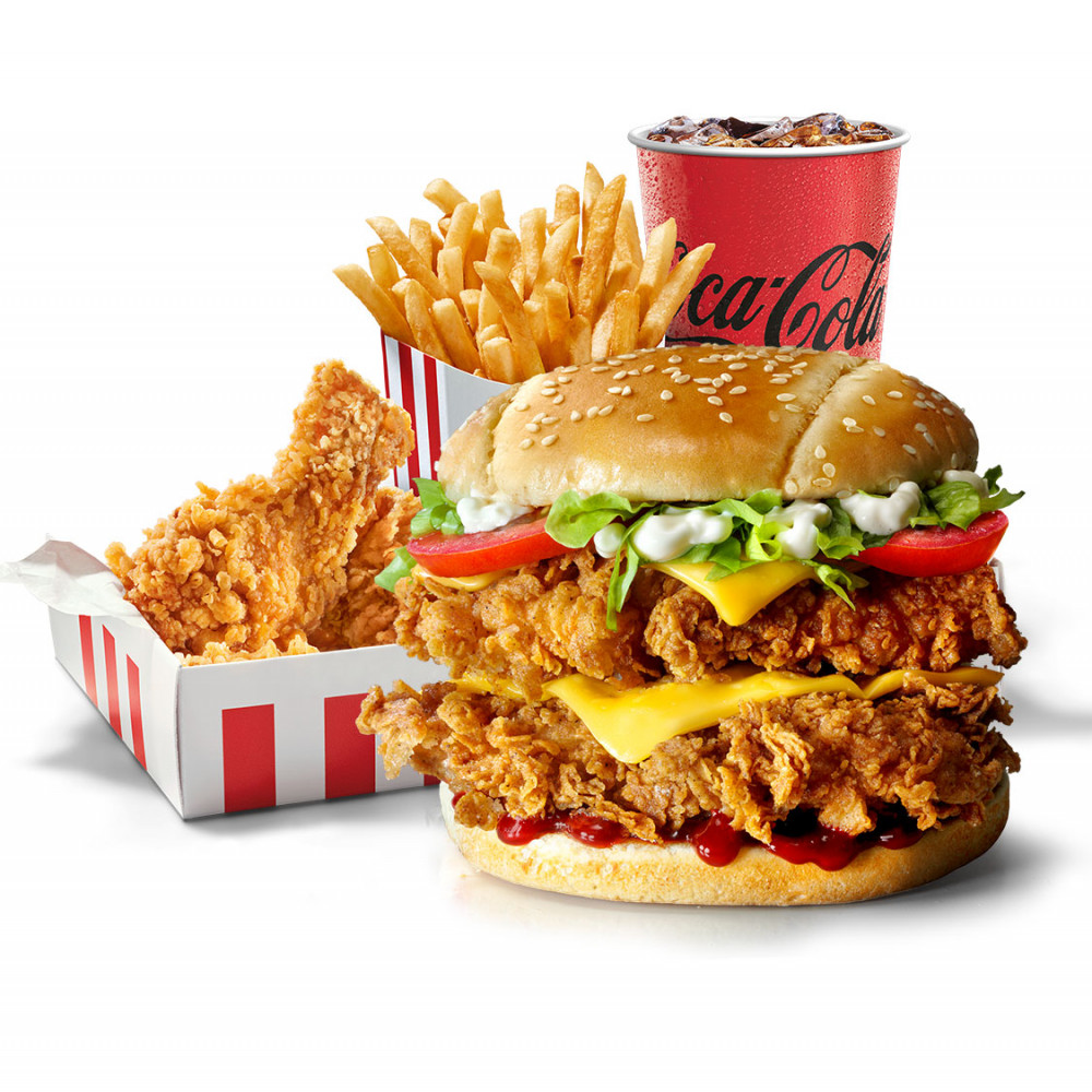 Dvojitý šampión z Kentucky: Double Original v boxe a k nemu 2 kusy šťavnatých Crispy Stripss, 1x Veľké hranolky, 1x príloha podľa výberu a 1x nápoj 0,4 l. So šťavnatými paradajkami, čerstvým ľadovým šalátom, čedarom, sladkokyslými nakladanými uhorkami, majonézou a kečupom je Double Original absolútne neodolateľný. Máš chuť sa do neho hneď zahryznúť? Objednaj si ho raz-dva cez službu Click & Collect a vyzdvihni v najbližšej pobočke.